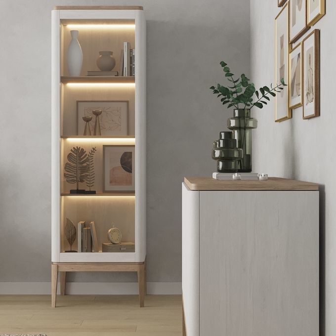Полки могут быть изготовлены из стекла или из МДФ и шпона дуба. Возможна комплектация витрины подсветкой. Вариант полок и необходимсоть комплектации витрины подсветкой указывайте в комментариях к заказу.