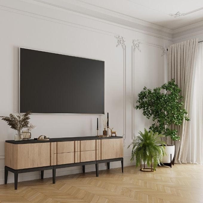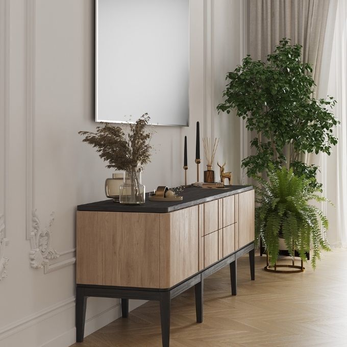 Основание корпуса каждого изделия из коллекции Иконс изготовлено из массива дуба, внутренние детали корпуса из МДФ, видимые детали корпуса, верхняя крышка, полки и фасады изготовлены из МДФ и шпона дуба, выдвижные ящики из фанеры.