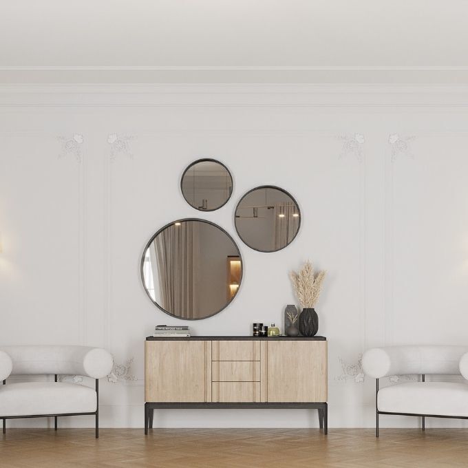 Основание корпуса каждого изделия из коллекции Иконс изготовлено из массива дуба, внутренние детали корпуса из МДФ, видимые детали корпуса, верхняя крышка, полки и фасады изготовлены из МДФ и шпона дуба, выдвижные ящики из фанеры.
