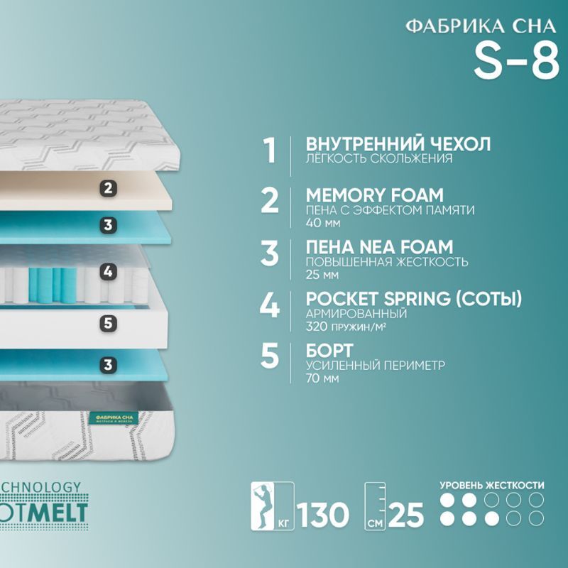 7-ми зональный пружинный блок Pocket Spring. шахматной сборки, точечно поддерживает позвоночник в правильном положении, а зоны жесткости регулируют уровень давления на матрас, позволяя отлично высыпаться ночью. Сочетание анатомической пены Nea Foam и пены с эффектом памяти Memorix дополнительно поддерживают спину, способствуя скорейшему восстановлению сил, а слой войлока и упругой пены Nea Foam улучшают анатомические свойства матраса.