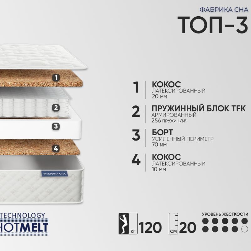 Матрас Топ-3 имеет самую жесткую сторону из всей коллекции