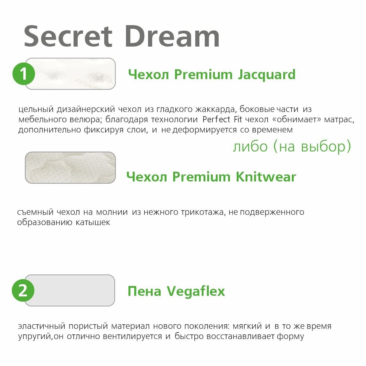 Чехол на выбор: Premium Jacquard - цельный из роскошного жаккарда с бурлетом из мебельного велюра или Premium Knitwear - съемный чехол с технологией Sleep&Clean (разъемная молния по всему периметру) из плотного трикотажа.