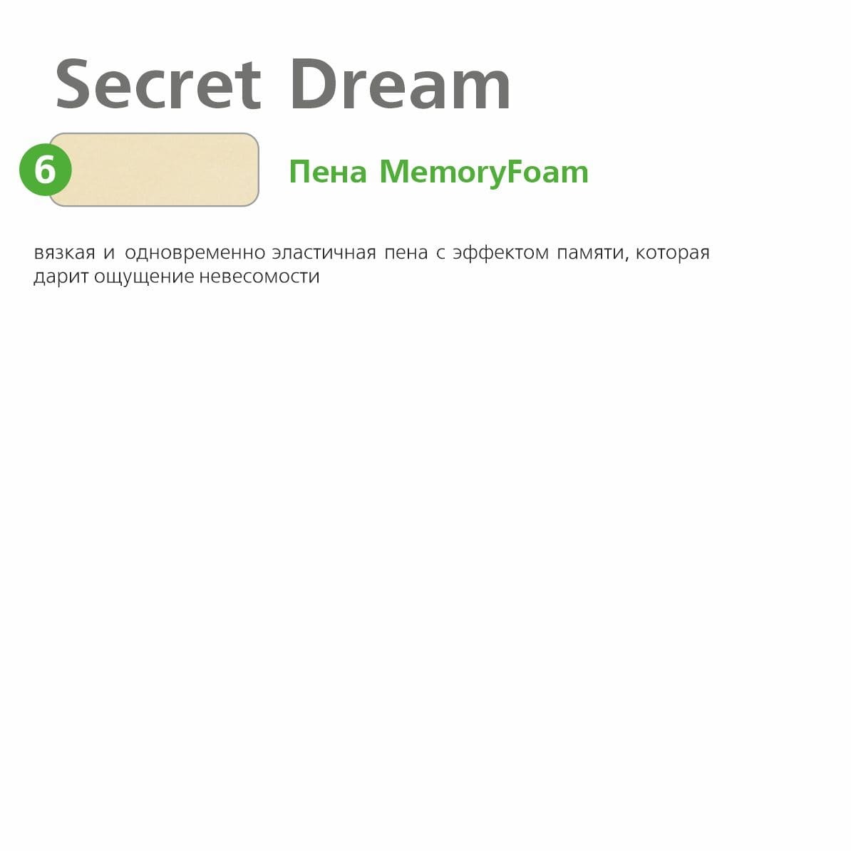 - MemoryFoam - инновационный материал с памятью формы, разработанный для нужд аэрокосмической отрасли. Обладает одновременно вязкостью и эластичностью, что дарит спящему ощущение невесомости.