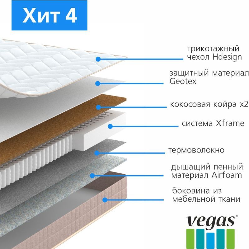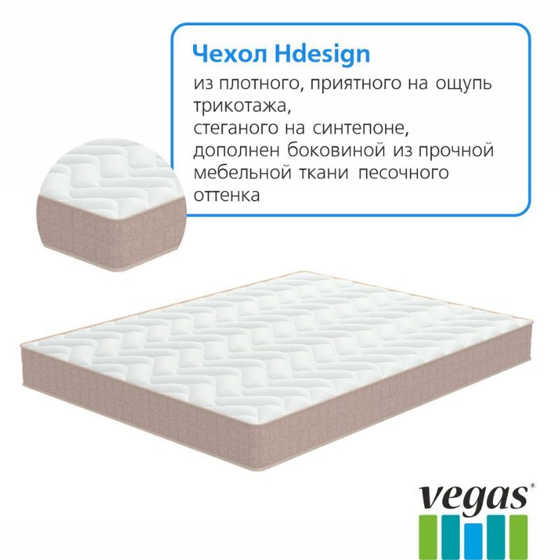 - Чехол Hdesign: несъемный чехол из трикотажной ткани повышенной плотности, устойчивой к появлению катышек и затяжек. Боковые части чехла выполнены из плотной мебельной ткани песочного оттенка с рисунком-имитацией рогожки и дополнены кантом. Для простого ухода за матрасом рекомендуем приобрести защитный наматрасник из коллекции Vegas Protect.