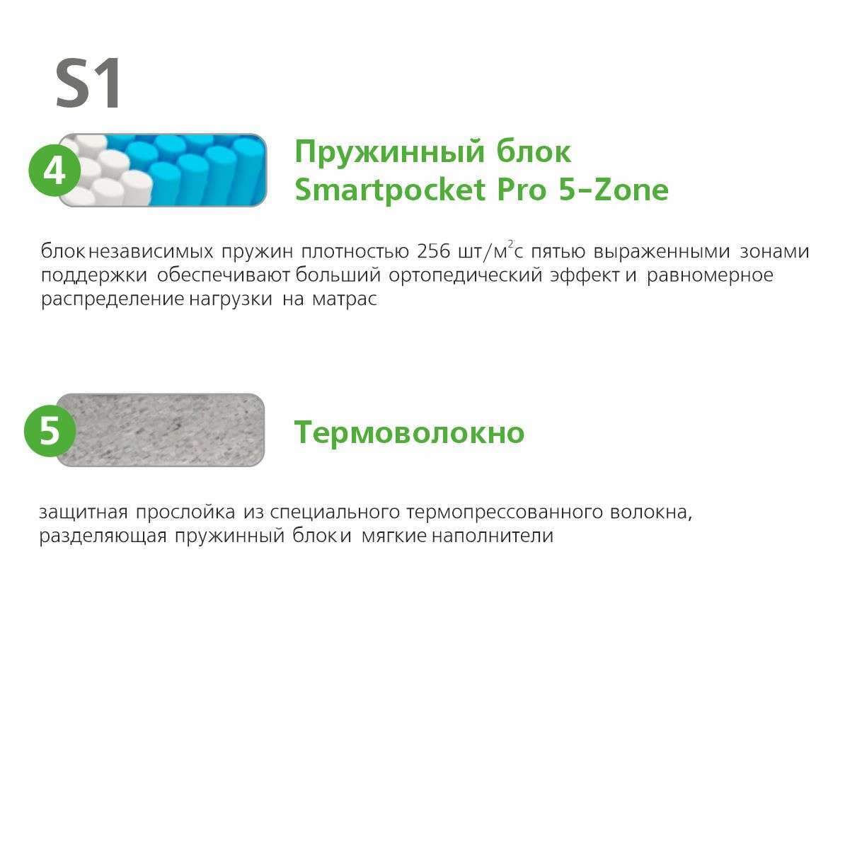 - 5-зональный пружинный блок Smartpocket PRO 5-ZONE - eсовершенствованный блок независимых пружин Smartpocket плотностью размещения 256 пружин на м2. Каждая пружинка упакована в отдельный чехол и работает самостоятельно, отдельно, независимо от других пружин в блоке. Такой блок принимает форму тела спящего на матрасе - в этом и заключается ортопедический эффект. Усиление ортопедического эффекта происходит благодаря пяти выраженным зонам поддержки, которые равномерно распределяют нагрузку на матрас для более комфортного и здорового сна.