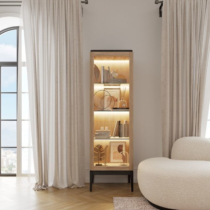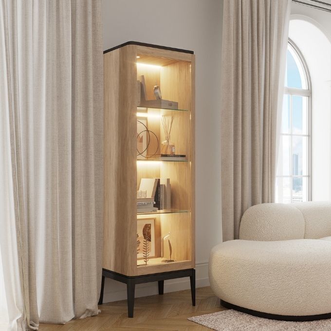Основание корпуса каждого изделия из коллекции Иконс изготовлено из массива дуба, внутренние детали корпуса из МДФ, видимые детали корпуса, верхняя крышка, полки и фасады изготовлены из МДФ и шпона дуба, выдвижные ящики из фанеры.