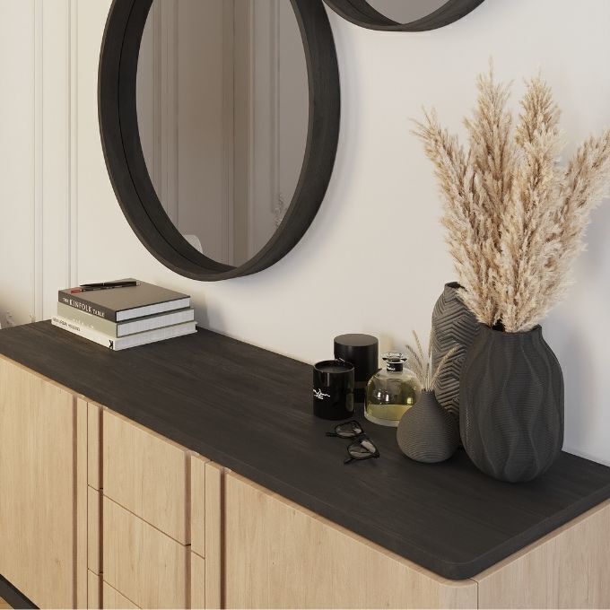 Основание корпуса каждого изделия из коллекции Иконс изготовлено из массива дуба, внутренние детали корпуса из МДФ, видимые детали корпуса, верхняя крышка, полки и фасады изготовлены из МДФ и шпона дуба, выдвижные ящики из фанеры.